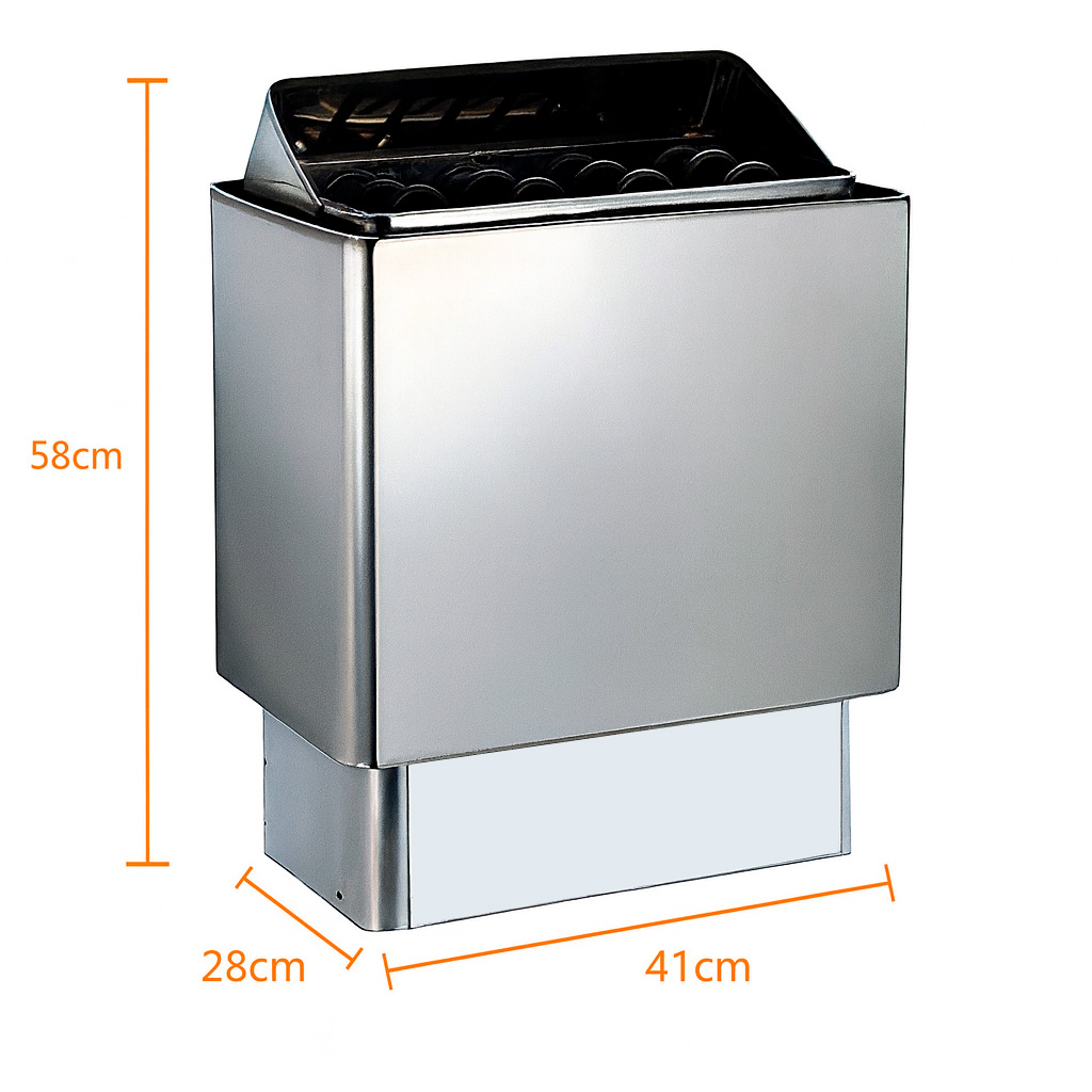 תנור סאונה חשמלי בהספק 9 קילוואט, עם ציון גובה, רוחב ועומק.