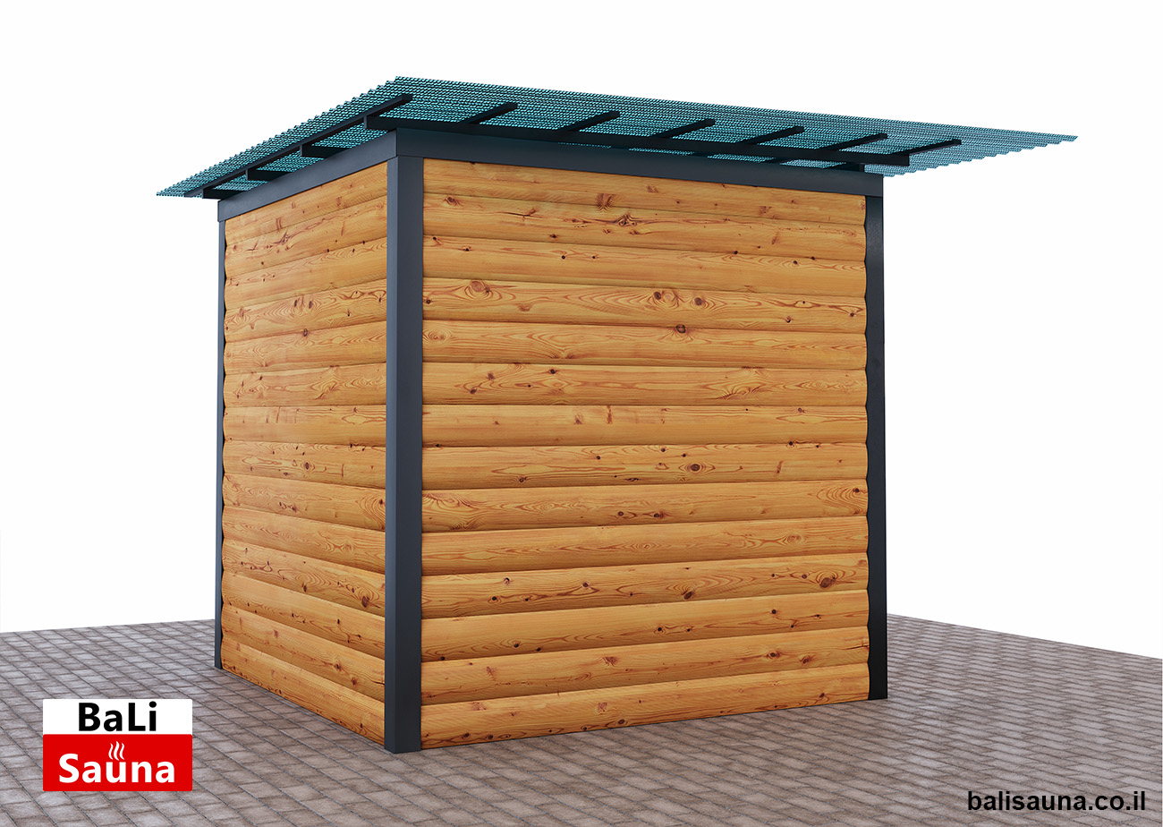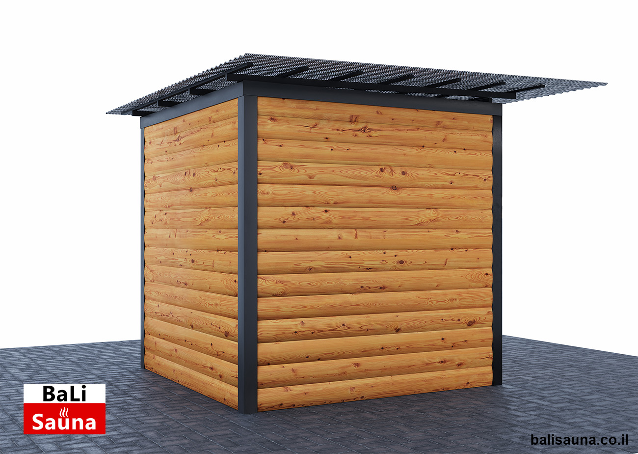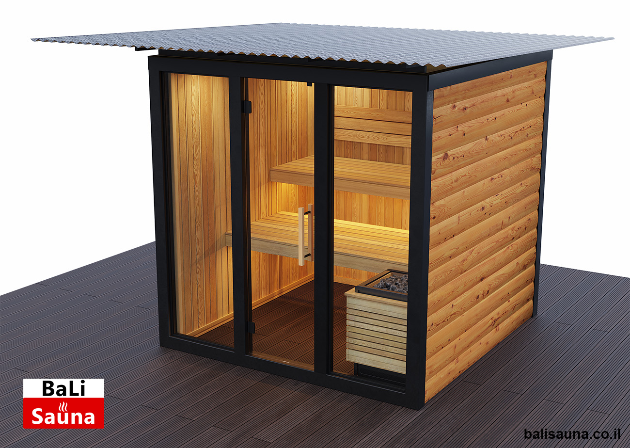 סאונה חיצונית פינתית ויבשה, מותאמת לבחירת הלקוח, לא כוללת רצפה ודורשת הרכבה על רצפת עץ, עם דגש על הכנה ויישור של השטח מראש