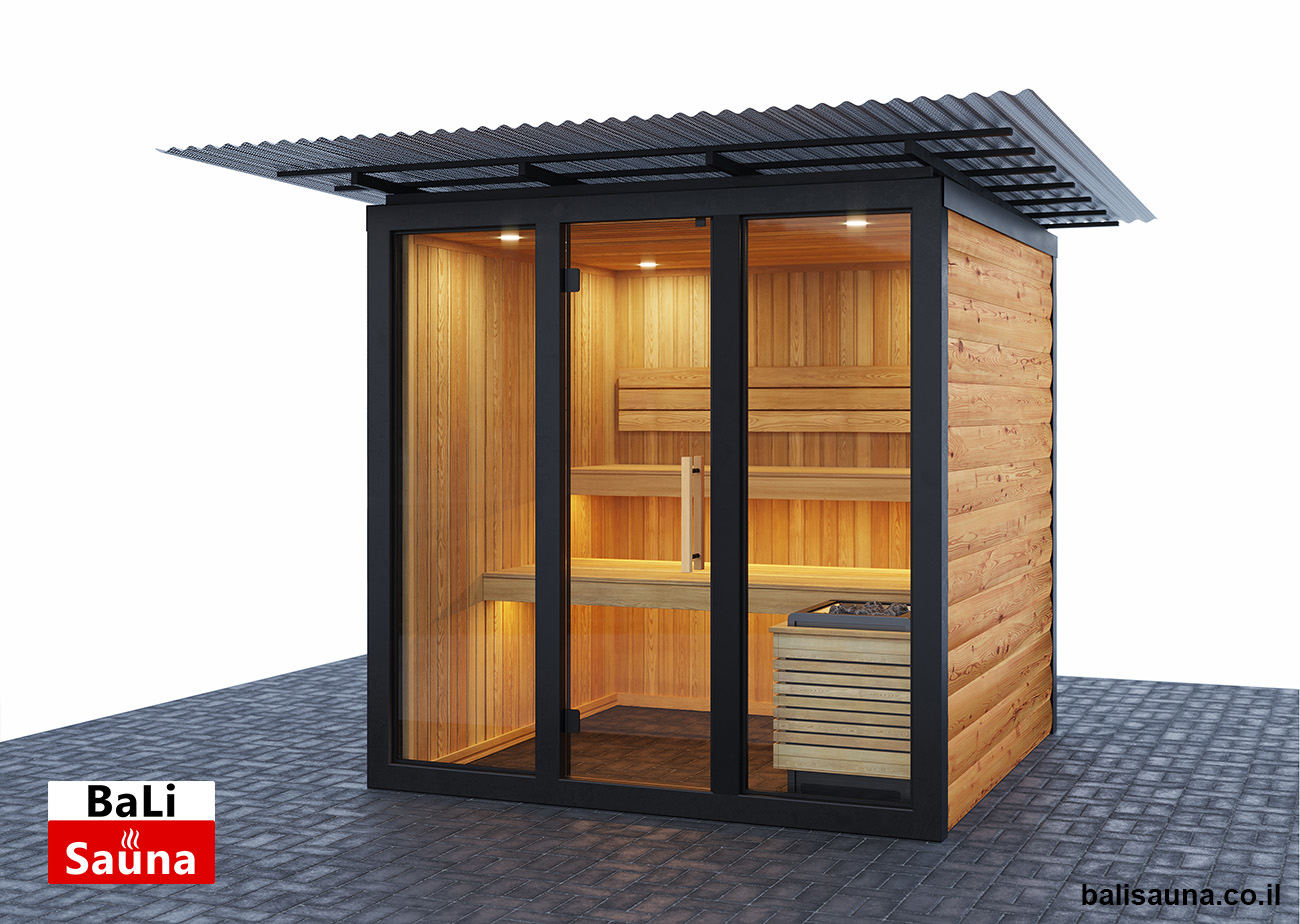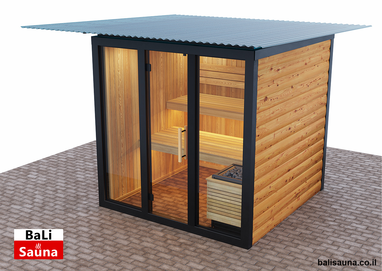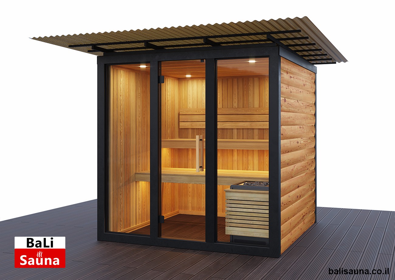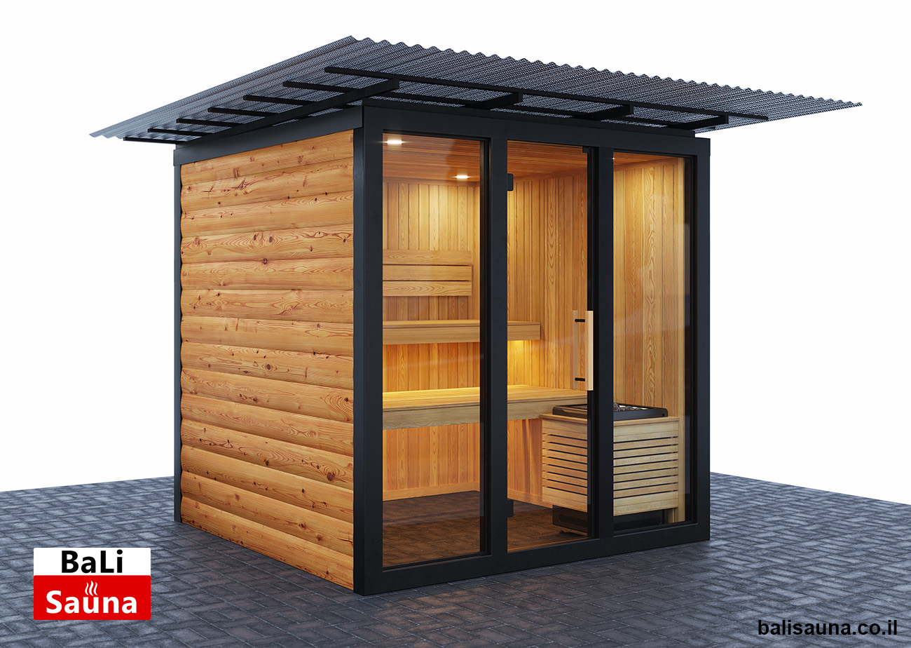סאונה חיצונית פינתית ויבשה, מותאמת לבחירת הלקוח, לא כוללת רצפה ודורשת הרכבה על רצפת עץ, עם דגש על הכנה ויישור של השטח מראש